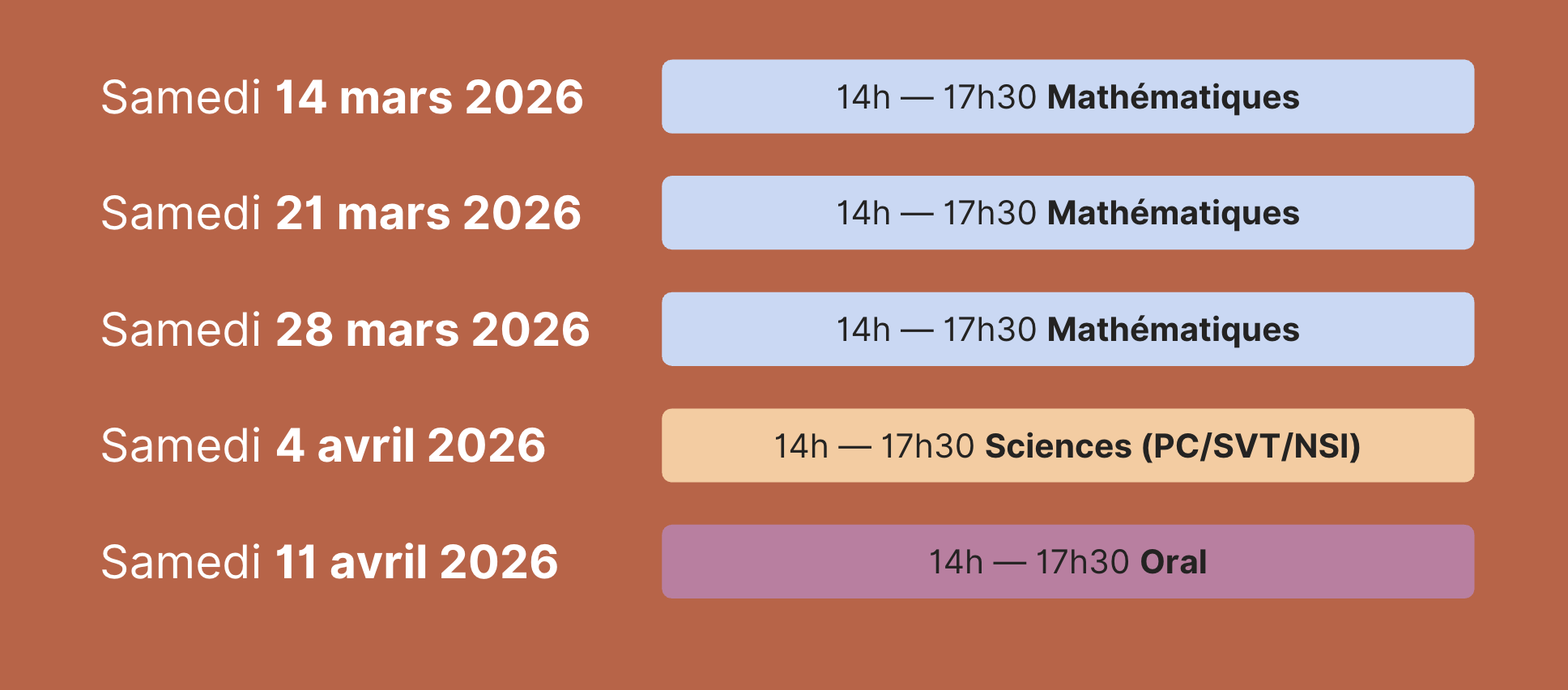 L’idéal est de vivre sa prépa à La Toussaint ou à Noël. Statistiquement, les élèves qui ont les meilleurs résultats sont ceux qui s’y prennent le plus tôt dans l’année pour préparer leurs concours. Les premières sessions sont souvent en plus petit comité ce qui permet un suivi particulièrement personnalisé. Beaucoup d’élèves pensent que février est le moment le plus opportun mais les épreuves portant essentiellement sur des notions déjà vues en classe de 1ère, ce n’est pas un avantage particulier de réaliser la prépa en février. La prépa des vacances de février n’en demeure pas moins une excellente rampe de lancement à quelques semaines des concours.